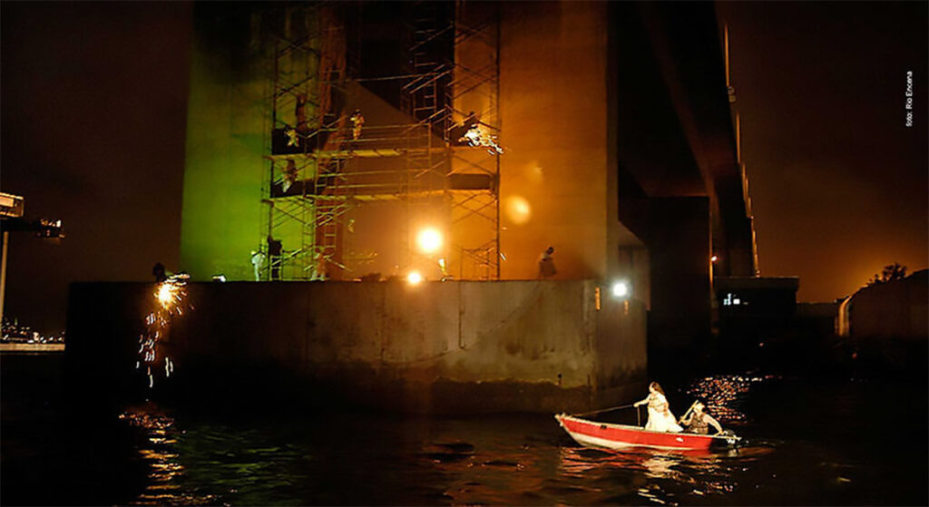 La trajectoire du Teatro da Vertigem est un véritable enchaînement de spectacles coups de poing. Les trois premiers, Paradis perdu (1992), Le livre de Job (1995) et Apocalypse 1.11 (2000), regroupés sous le terme de trilogie Biblique, sont créés pour un public en déambulation dans des lieux non conventionnels, non-théâtraux, à savoir une église catholique, un hôpital désaffecté et une prison désaffectée. Après cette première décennie de travail en espace clos, le Vertigem décide d’aller vers l’extérieur d’élargir son champ d’action e et d’investir le paysage, Pour aborder l’identité brésilienne, le groupe choisit de s’emparer d’une des principales artères de la ville de Sāo Paulo, le fleuve Tietê, l’un des plus pollués au monde. Surmontant les difficultés techniques et sanitaires, il y créa le BR-3 en 2006, un spectacle sous forme d’embarcation où les spectateurs, embarqués sur à bord d’un bateau mouche, assistaient à ce contre-monument de l’histoire brésilienne se déroulant sur les berges du fleuve mais également sur le fleuve lui-même. De ce spectacle, le metteur en scène José Celso Martinez Corrêa écrivit que « quand apparaît une chose comme BR-3 c’est un symptôme que le pays est en train de vivre un grand moment, qui appelle toutes les énergies de la création pour les transformations que nous devrons faire. Aucune société décadente ne produit une œuvre pareille. Le théâtre devient l’endroit de l’énergie productrice de la joie créative capable d’affronter les impasses non résolues par la violence. ».