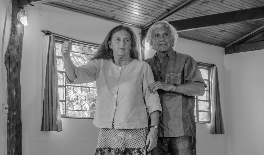 Pour la réalisation de ce stage à l’ARTA, Antônio a convié deux de ses partenaires de travail de longue date, rencontrés lors de ses incursions européennes, la metteure en scène et dramaturge Maria Clara Ferrer et l’acteur Nicolas Gonzales. Faisant dialoguer leurs recherches actuelles et réunissant leurs outils de travail, les trois artistes-chercheurs proposent, pour ce stage, une immersion dans la matrice du Teatro da Vertigem — aussi bien en ce qui concerne la démarche in site specific que le « processo colaborativo » — alliant deux versants indissociables, l’intérieur et l’extérieur. Ces deux versants se développent principalement sur deux niveaux, le corps et l’espace.