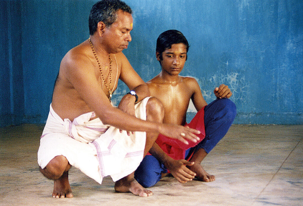 Les bases. Les différents moyens de jeu seront entraînés séparément afin d’éveiller pleinement la conscience de l’implication de chaque partie du corps dans l’acte théâtral. L’apprentissage de la psalmodie, les sauts et les exercices d’assouplissement et de renforcement du corps forment le « corps-physique » (sariram) : une sorte de « cadre », dit le maître, dans lequel se développe ensuite la sphère de jeu. Celle-ci sera appréhendée grâce aux « exercices des yeux » et à l’apprentissage des gestes. Les dix principales figures oculaires et les 24 mudra –« sceaux » des doigts mis en mouvement de manière à former des mots puis des phrases – mitatifs, suggestifs et conventionnels. Le travail des émotions est à la base de l’incarnation des personnages et de l’art des gestes. Concrètement, l’acteur apprend à dépeindre plastiquement les « neuf sentiments » (navarasa) que sont : l’amour, le mépris, la tristesse, la colère, l’héroïsme, la peur, le dégoût, l’émerveillement et la paix.