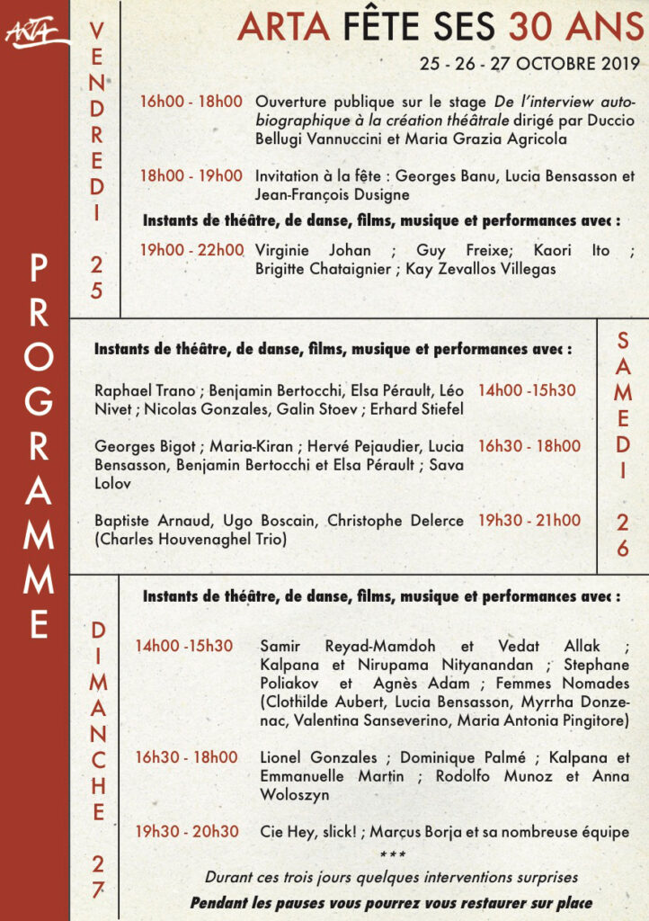 ARTA fête ses 30 ans avec trois jours de portes ouvertes ! Instants de théâtre, de danse, films, musique, effervescence des cultures : l’esprit et la démarche de l’école avec celles et ceux qui l’ont traversée.