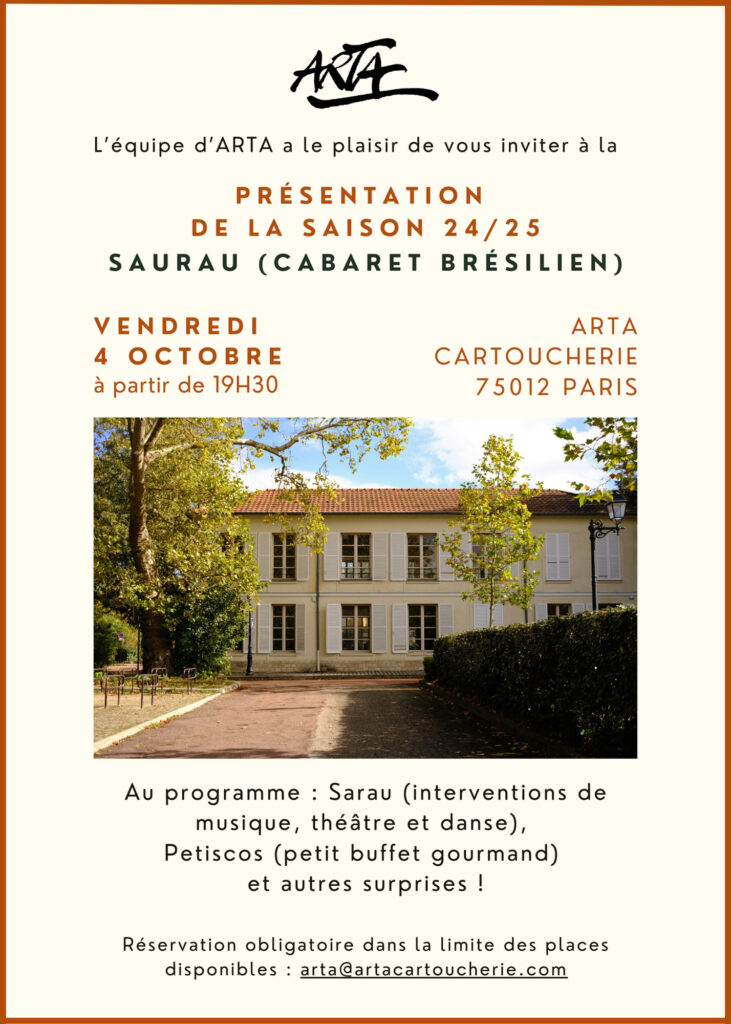 L’équipe d’ARTA a le plaisir de vous inviter à la présentation de la saison 2024/2025 suivie d’un Sarau (petit cabaret brésilien), vendredi 4 octobre à 19h30 à ARTA – Cartoucherie.